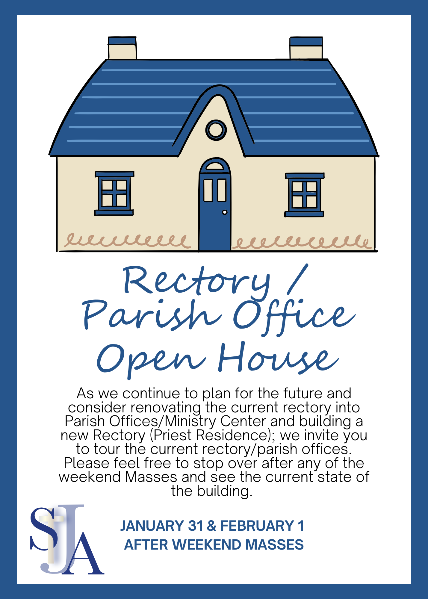 A BIG THANK YOU to everyone who registered for the Open House last weekend and we appreciate your understanding regarding the cancellation of that event during to severe weather. However, we are pleased to announce that we have rescheduled our Celebratory Mass and Open House for February 1st.